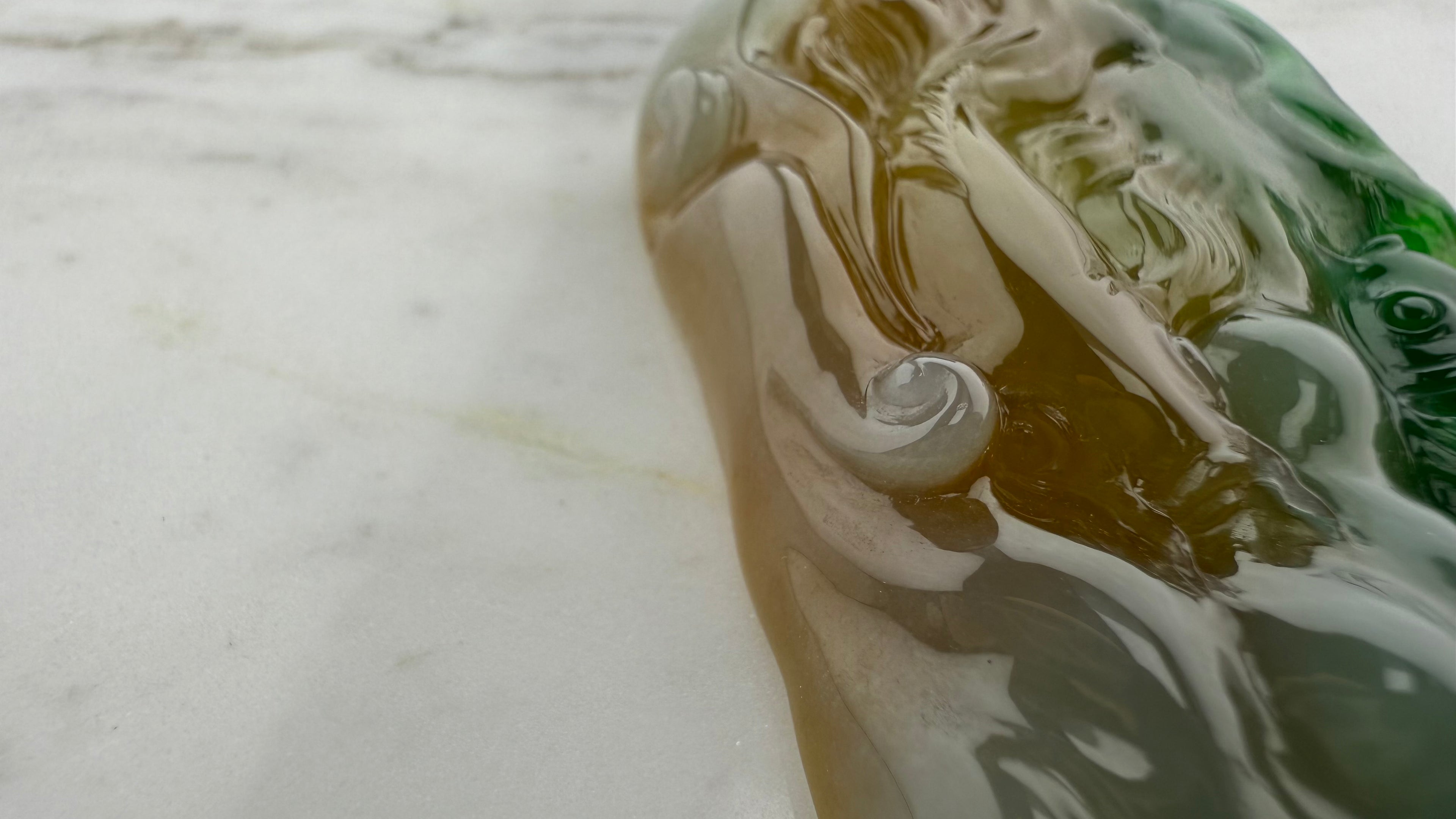 The Imperial Pisces Pendant showcases two Koi fish tail chasing with romance. Hand carved in supreme texture, each Koi fish holds an solid individual color showcasing the true beauty of Natural Jadeite. The watery finishing mimics a river which brings the Koi fish a true home with love.
